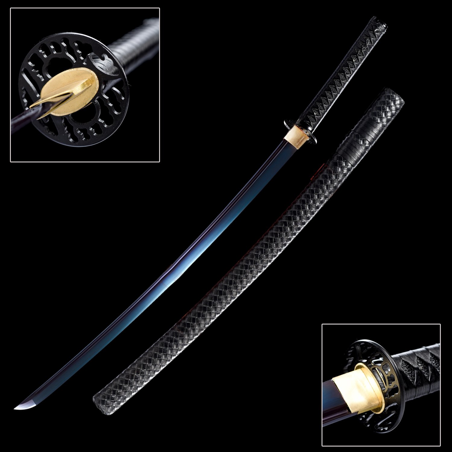 • Key Highlights: Special price with distinctive craftsmanship; 50# steel calcination + traditional quenching ensures stable hardness and toughness; the baked blue-purple blade and corroded engraving create a unique “Blue Spirit” style; the solid wood sheath wrapped in PU leather balances protection and texture, making it a competitive choice in the mid-range samurai sword market.