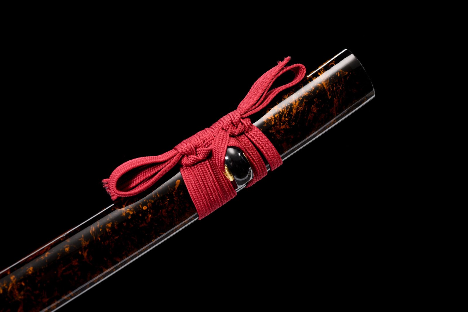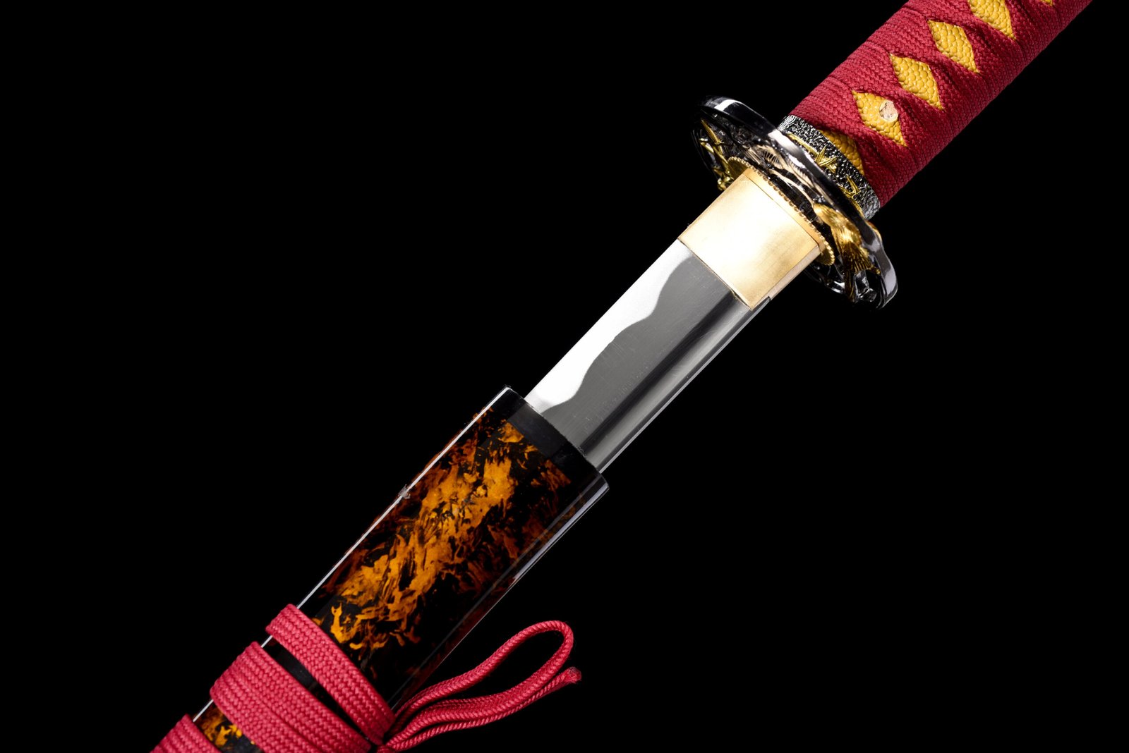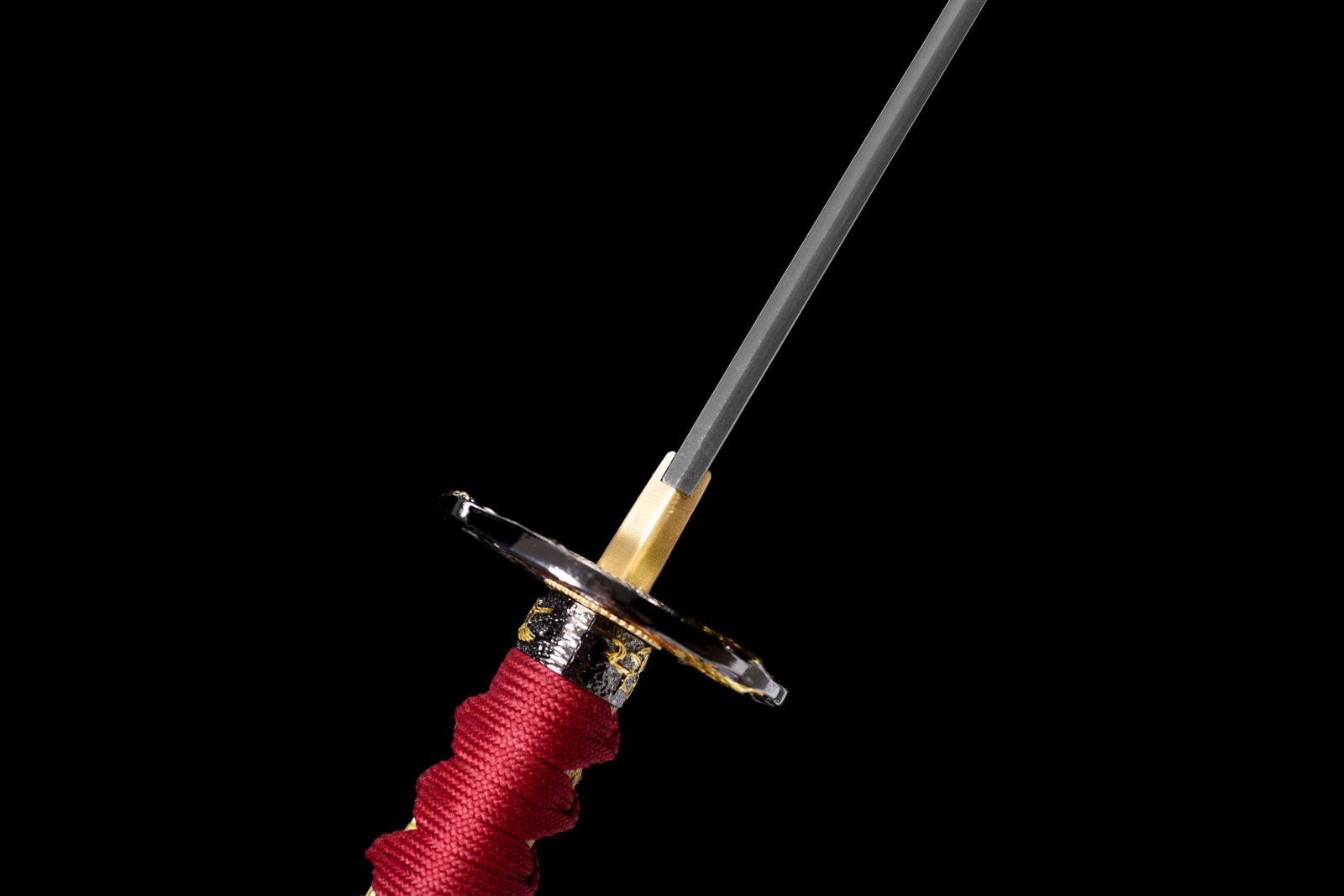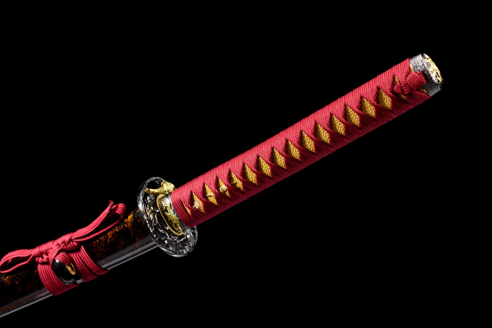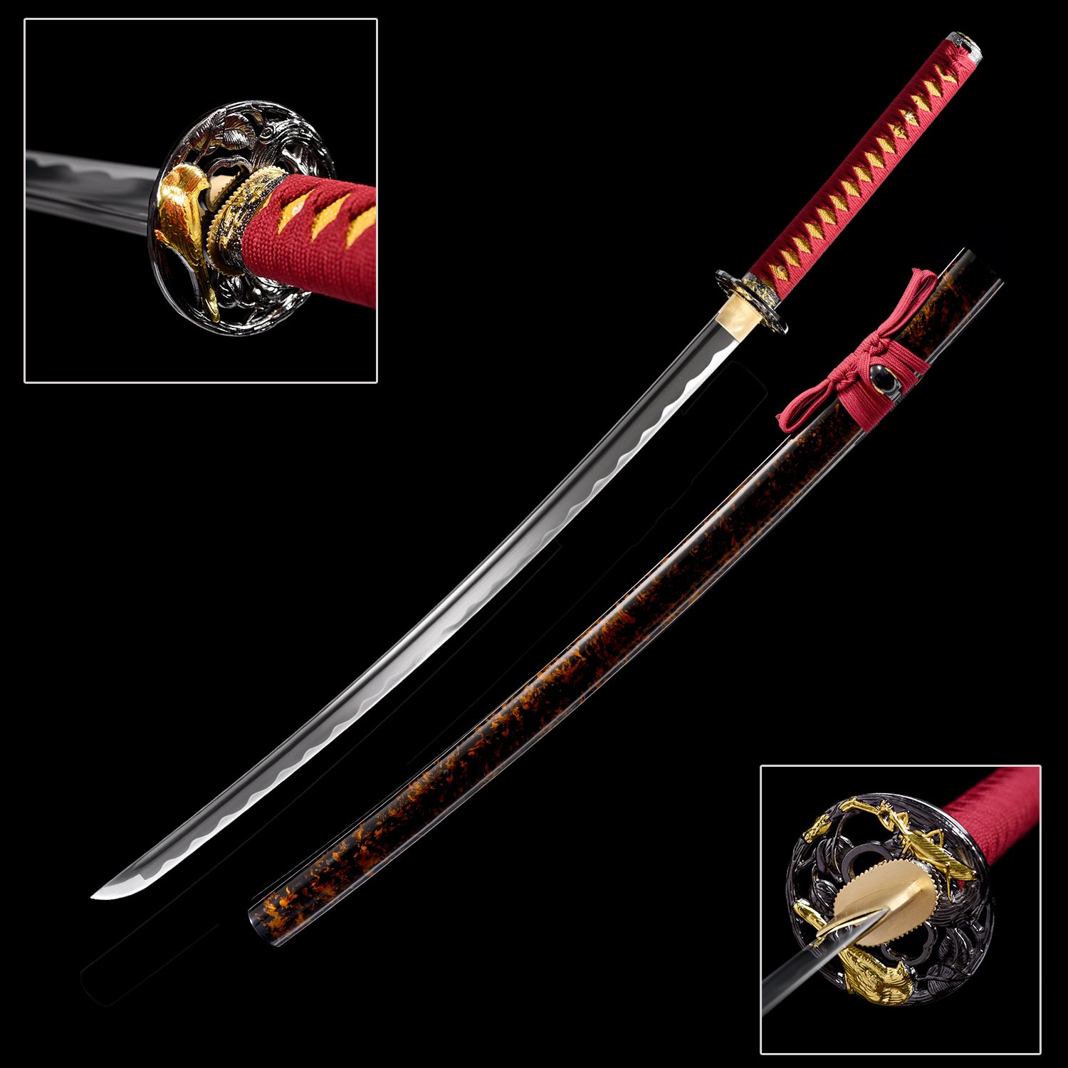 Samurai Sword (104cm Total Length) – 1045 Steel Blade (Grooved) + Black-Based Hardwood Scabbard (Glossy Gold Rings, Burgundy Ribbon)